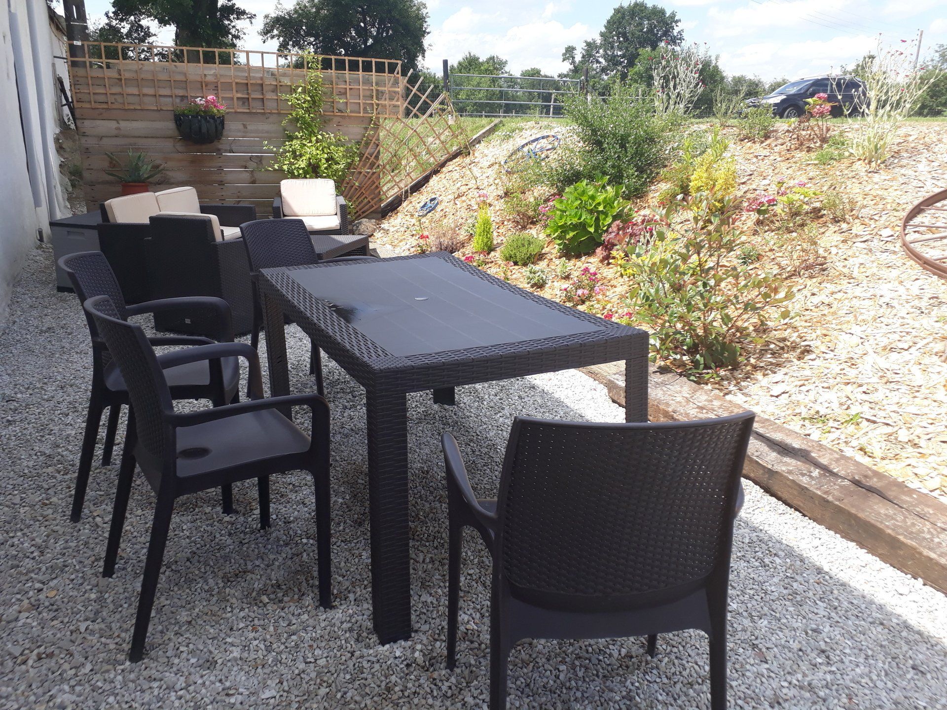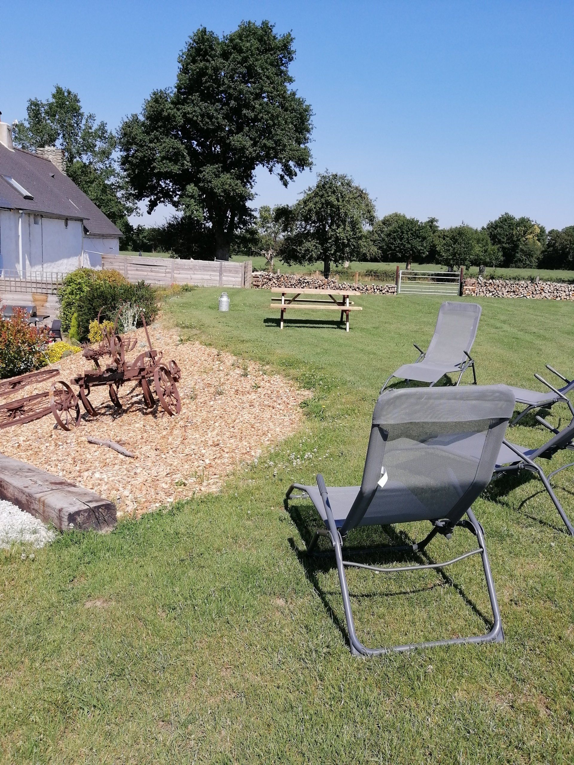 On the lawn, there is a picnic table and 4 loungers / recliners.