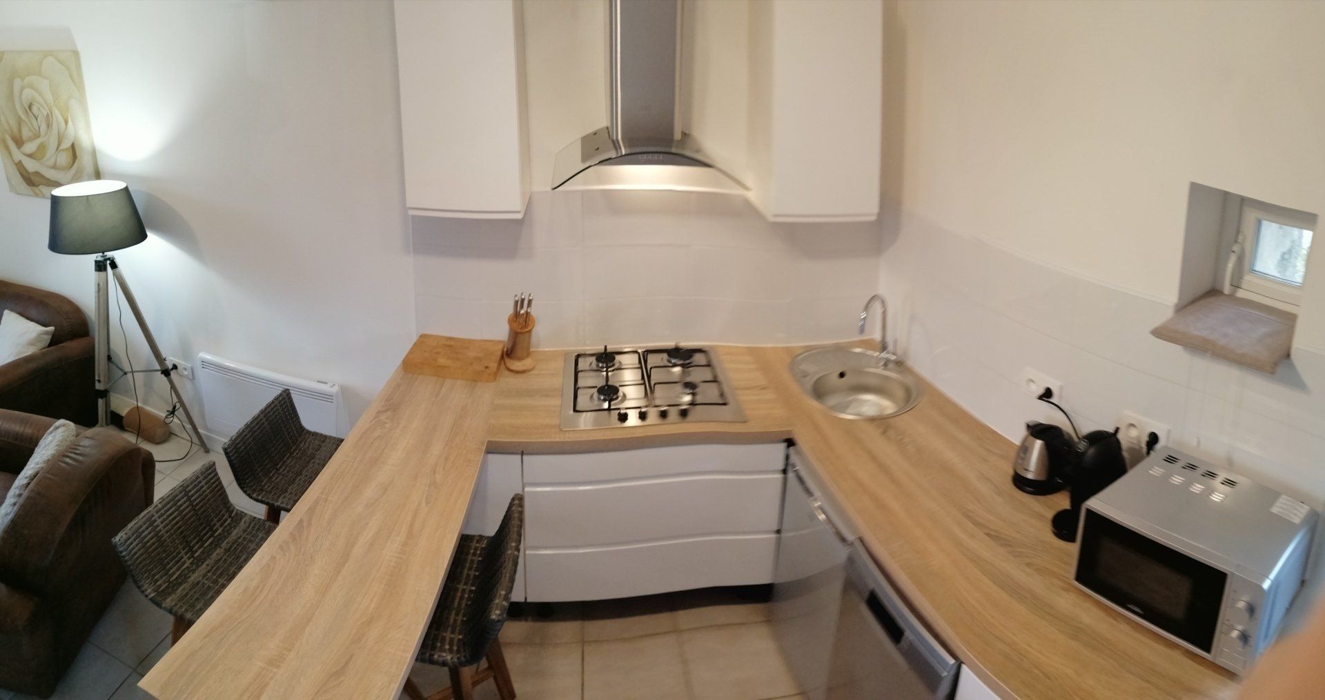 consists of a lounge area with 2 seater sofa and 2 easy chairs, kitchenette and dining / breakfast bar & four stools. A dishwasher, 4 ring gas hob, Dolce Gusto coffee machine, kettle, toaster, microwave, fridge with small freezer are also provided.